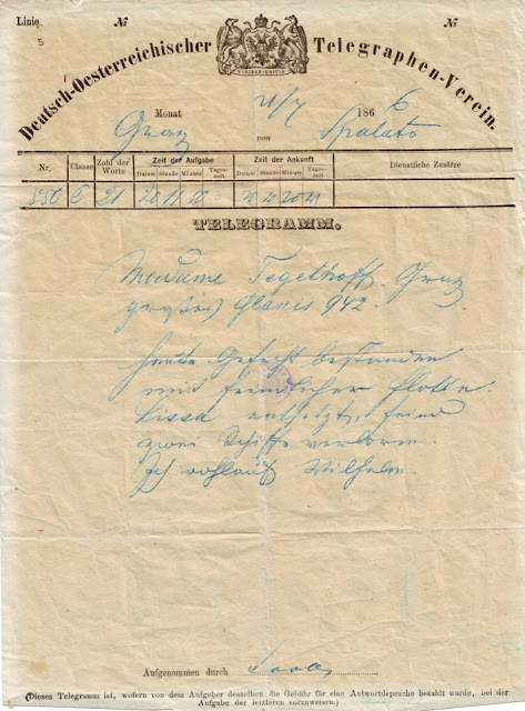 Il telegramma di Wilhelm von Tegetthoff alla madre sulla battaglia vittoriosa di Lissa: "Oggi siamo sopravvissuti alla battaglia con la flotta nemica. Lissa è salva. Il nemico ha perso due navi. Sono in buona salute. Wilhelm.