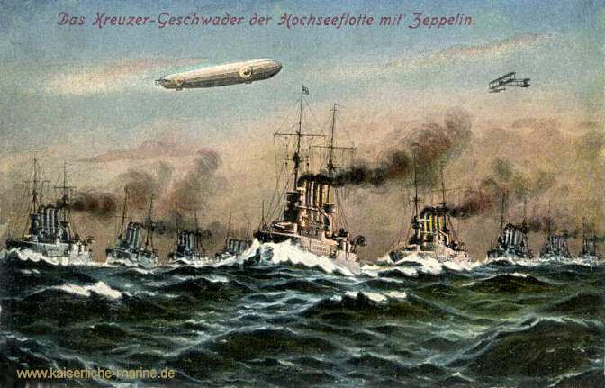 Sopra: Squadra d’incrociatori della Hochseeflotte imperiale tedesca con la copertura di velivoli e dirigibili Zeppelin, come avrebbe potuto essere durante una potenziale spedizione offensiva alla conquista degli Stati Uniti.
