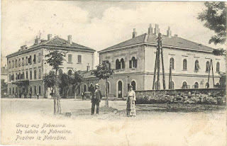 La stazione di Nabresina (in italiano ed in tedesco), in sloveno Nabrežine. Ora il toponimo è diventato "Aurisina" ed è un caso unico perchè nemmeno gli irredentisti si sognarono di cambiargli il nome e si chiamava "Nabresina" anche sulle carte del Regio Esercito del 1915, quelle che avevano italianizzato centinaia di altri toponimi come il Monte "Nevoso", il "Monte Nero" e "Caporetto".Sull'angolo sinistro dei 2 edifici, c'è un pezzo di granata murato alla rovescia dagli ita...liani, ricordo dei loro bombardamenti dalla Sdobba del 1917. Le stazioni di Opčine e Nabrežine erano due punti cruciali dei nostri rifornimenti militari per Trieste ed il fronte del basso e medio Isonzo, dove arrivavano con minime deviazioni, tutte le principali direttrici ferrate della Duplice Monarchia.